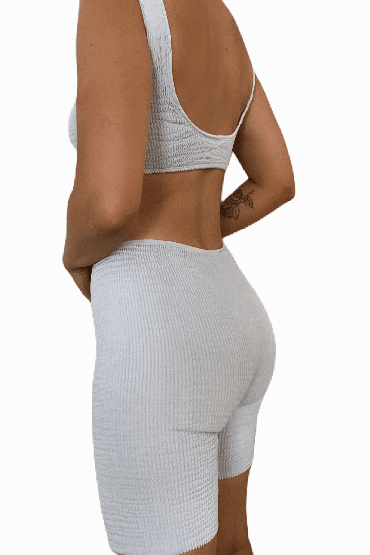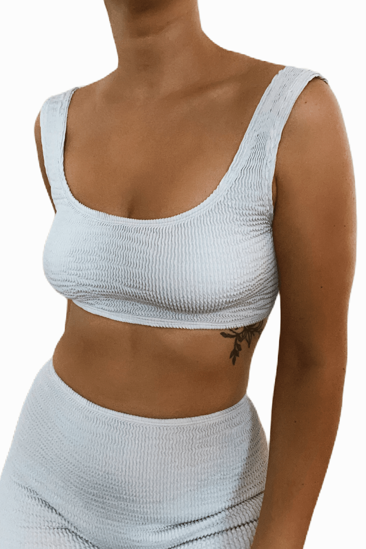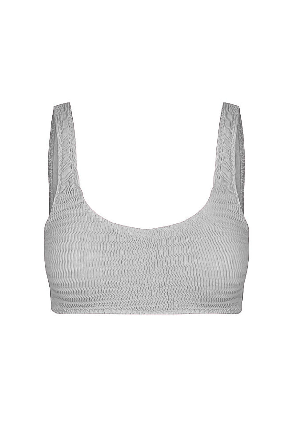 The Recycled Nylon Cloud Gray Rip Bikini Top is the classic sports crop cut bikini top. Great support and suits busts A-E cup. Pair with our Recycled Nylon East Coast Gray Bike Shorts to complete this set.